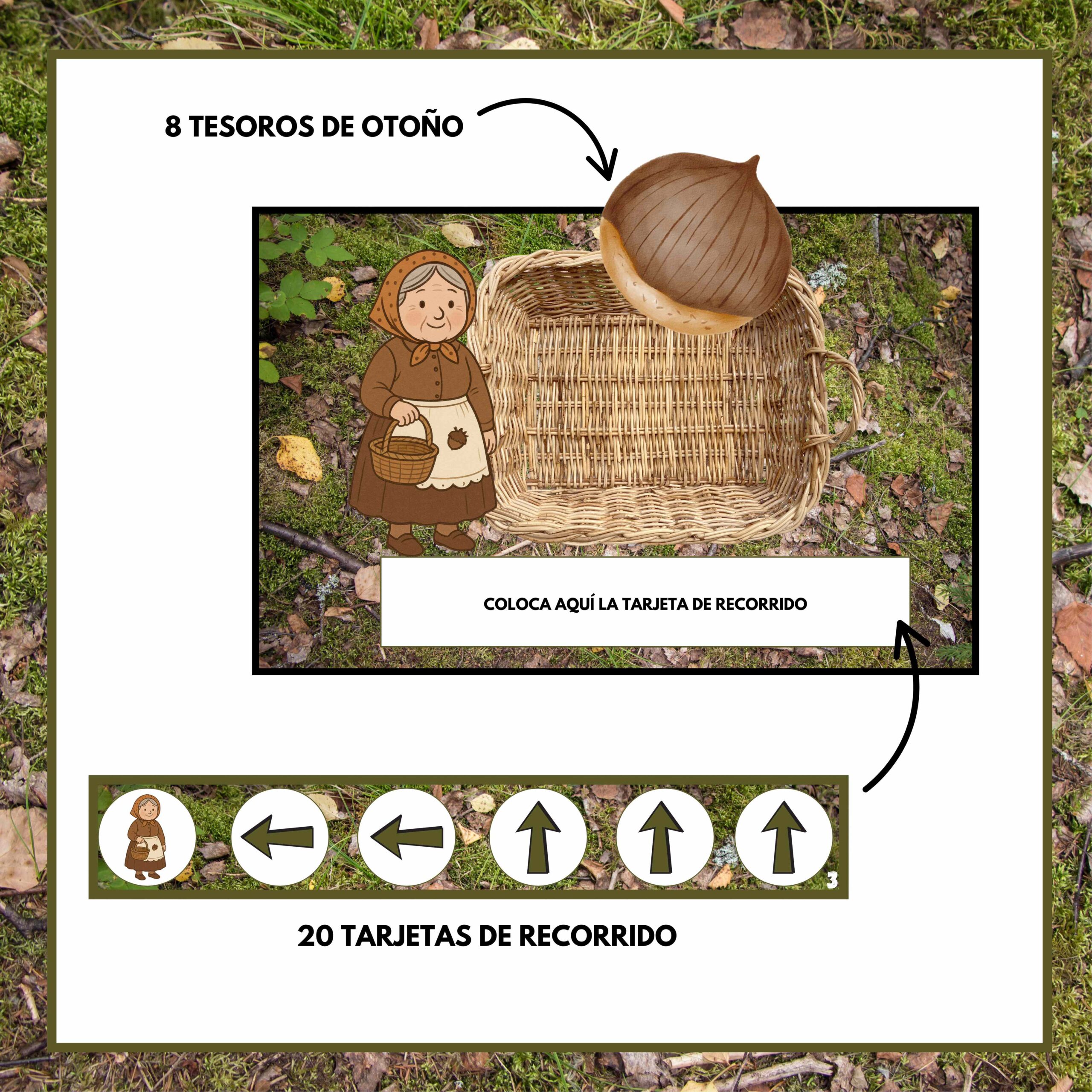 Al final de cada secuencia de flechas, llegará a un tesoro de otoño y tendrá que colocarlo dentro de su cesta. ¡Una manera lúdica de trabajar el otoño mientras se divierten guiando a la castañera!