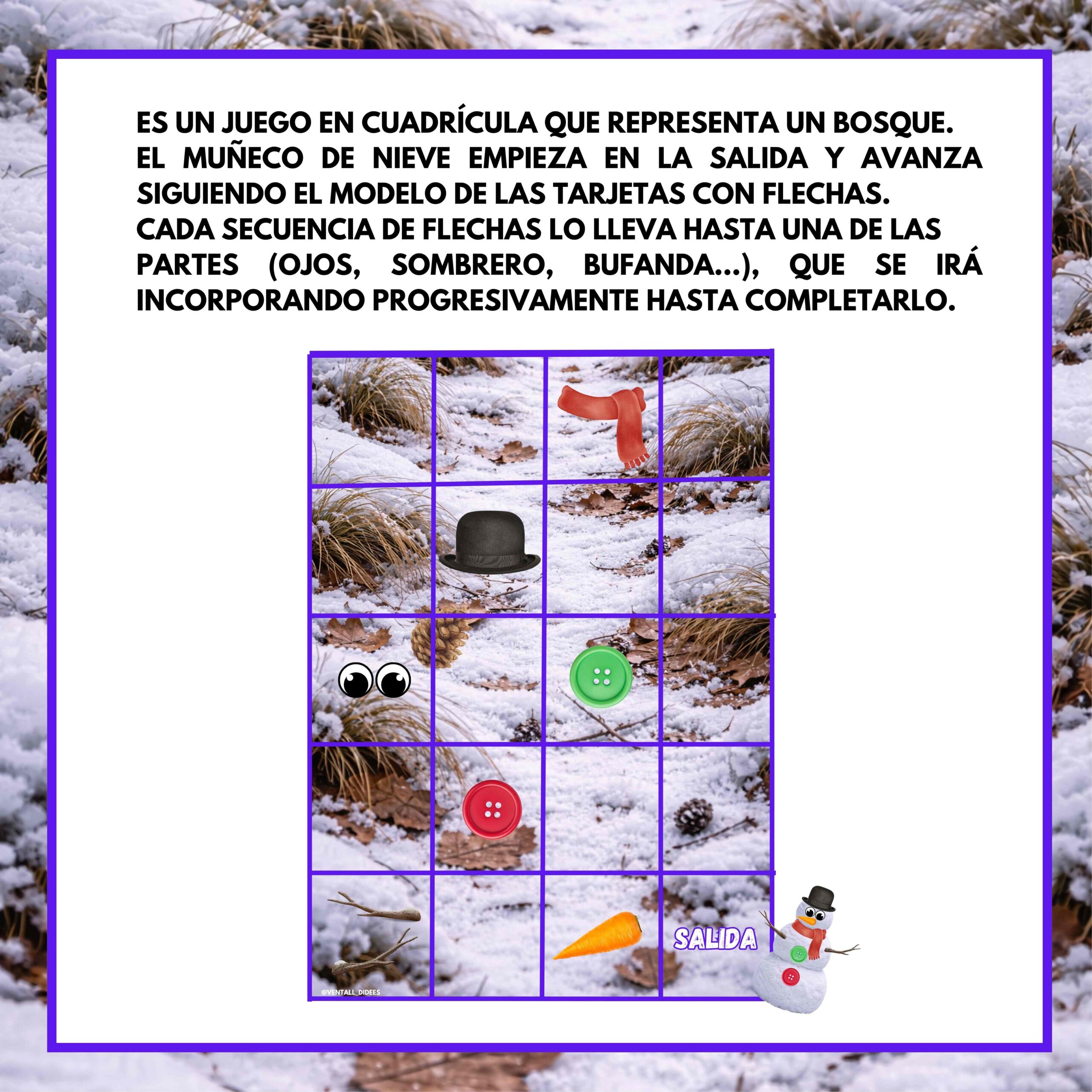 He creado un tablero con un bosque dividido en cuadrícula y la protagonista es un muñeco de nieve. Él empieza en la salida y, siguiendo las tarjetas con flechas (tarjetas de recorrido), tendrá que ir avanzando paso a paso por el camino del bosque.