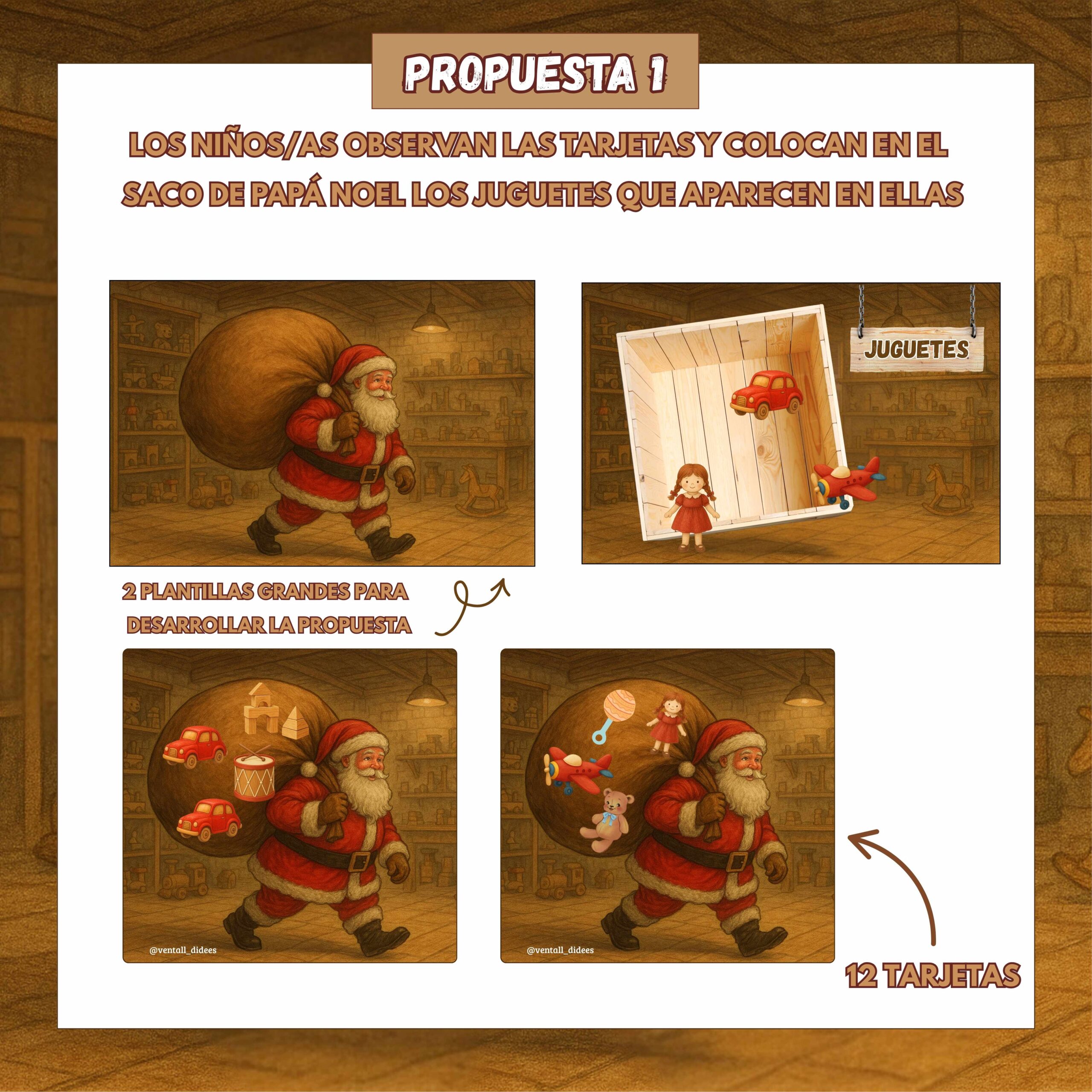 En esta primera propuesta, cada tarjeta muestra a Papá Noel con su saco lleno de juguetes.