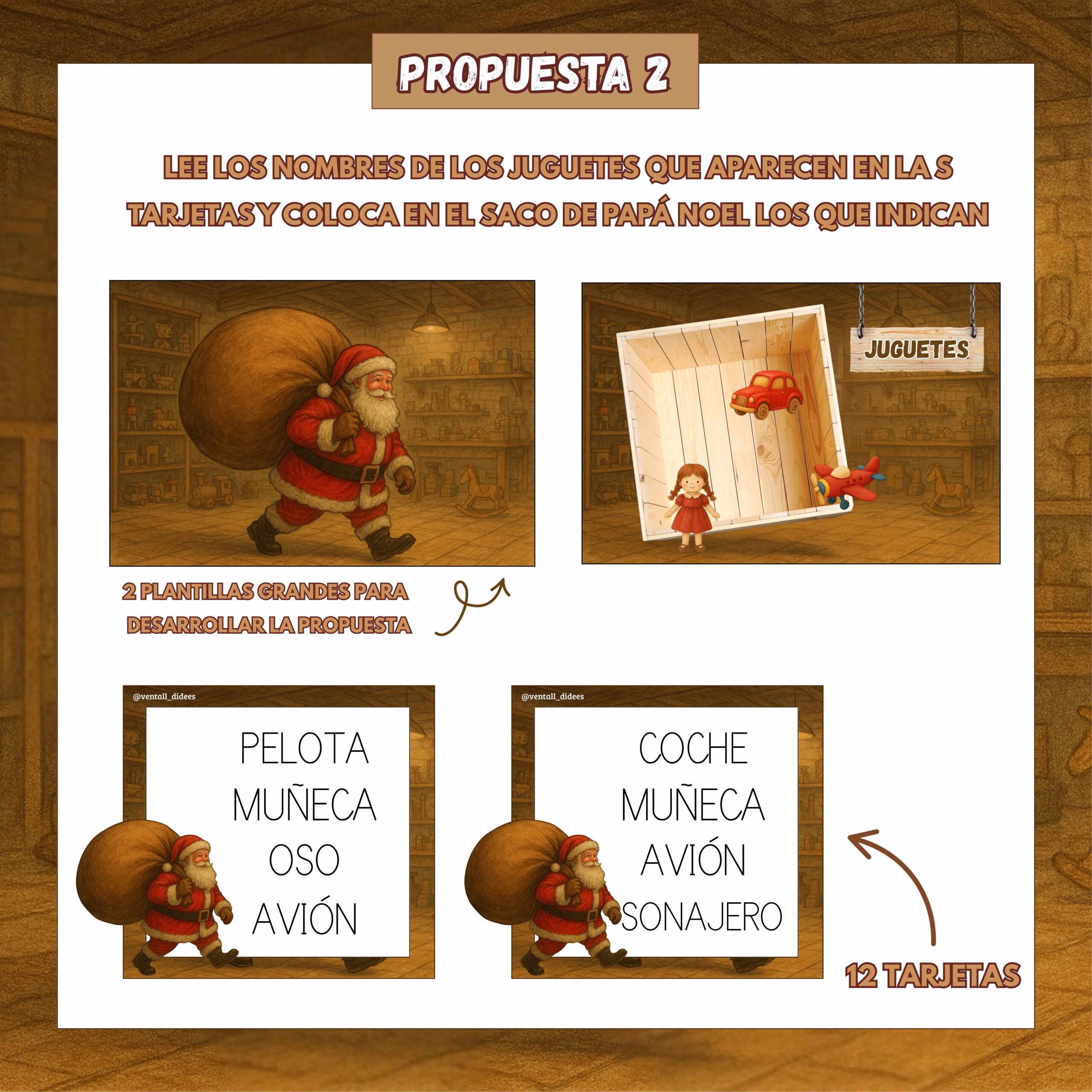 En esta segunda propuesta, cada tarjeta incluye el nombre de varios juguetes.