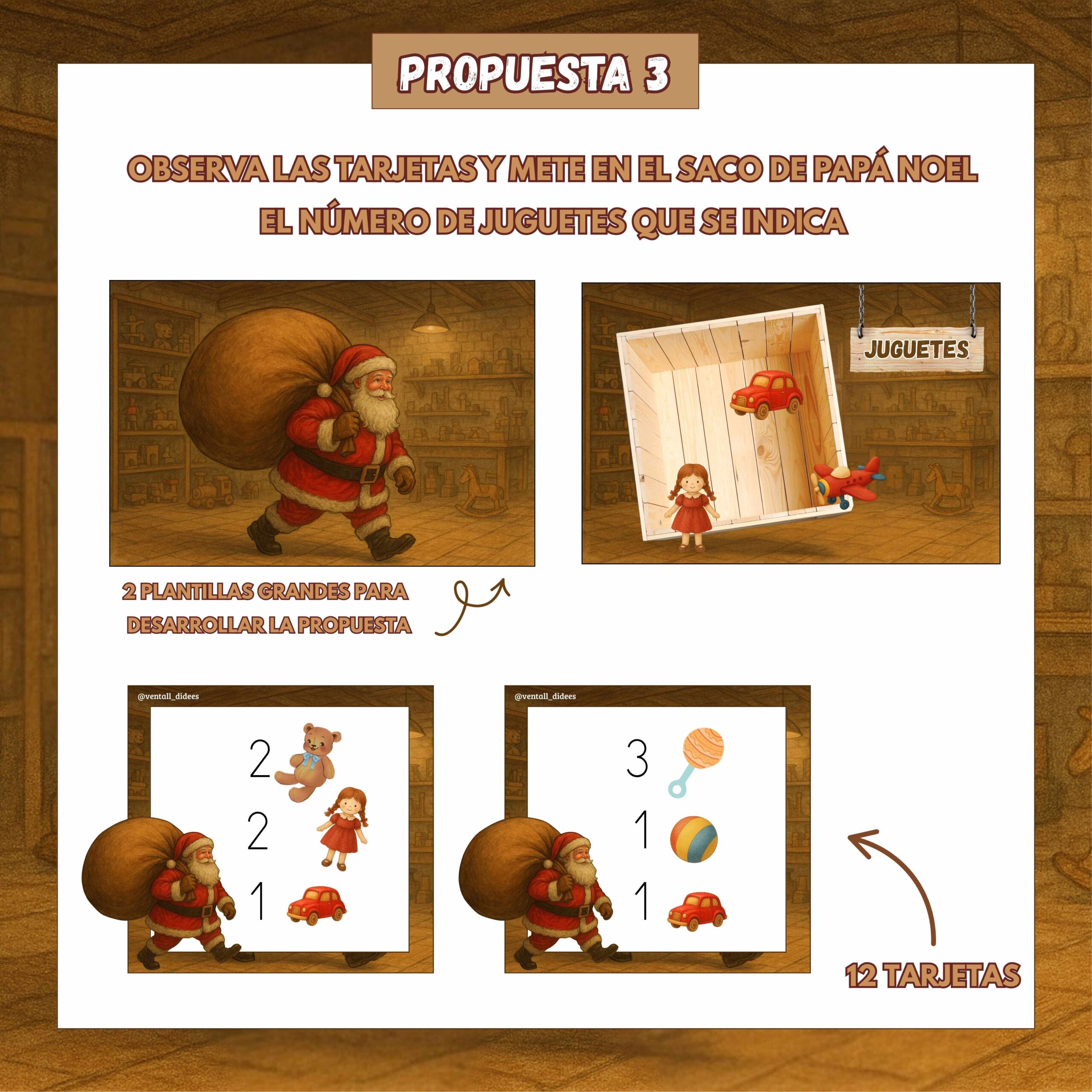 La tercera propuesta incluye tarjetas con números del 1 al 5, acompañadas por ilustraciones de los juguetes que deben colocarse dentro del saco.