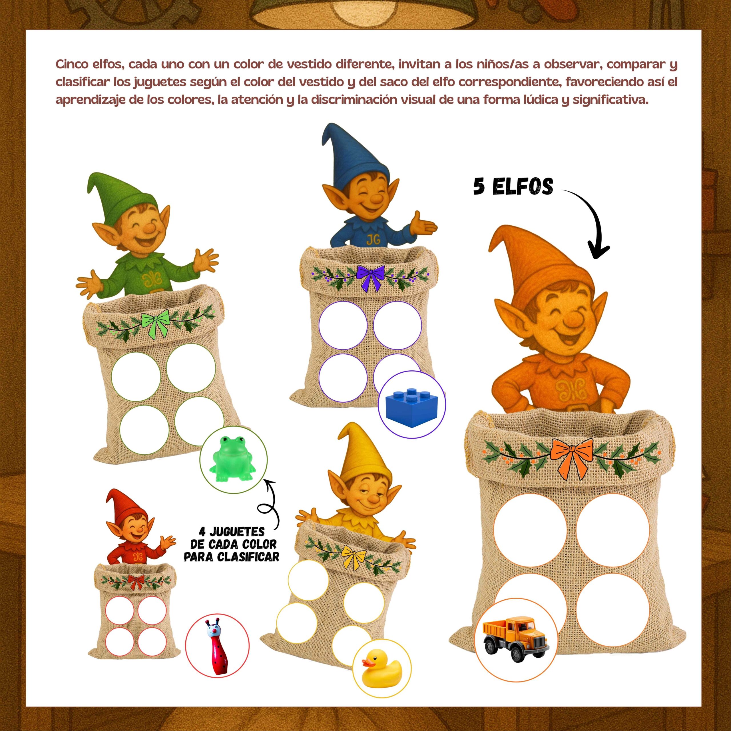 En este material encontraréis cinco elfos, cada uno con un saco de su color. En cada saco hay cuatro círculos, donde los niñ@s deberán clasificar los juguetes según el color del vestido de cada elfo. De esta forma, los peques practicarán el reconocimiento de colores, la coordinación mano-ojo y la atención al detalle, mientras se sumergen en una actividad llena de magia navideña.