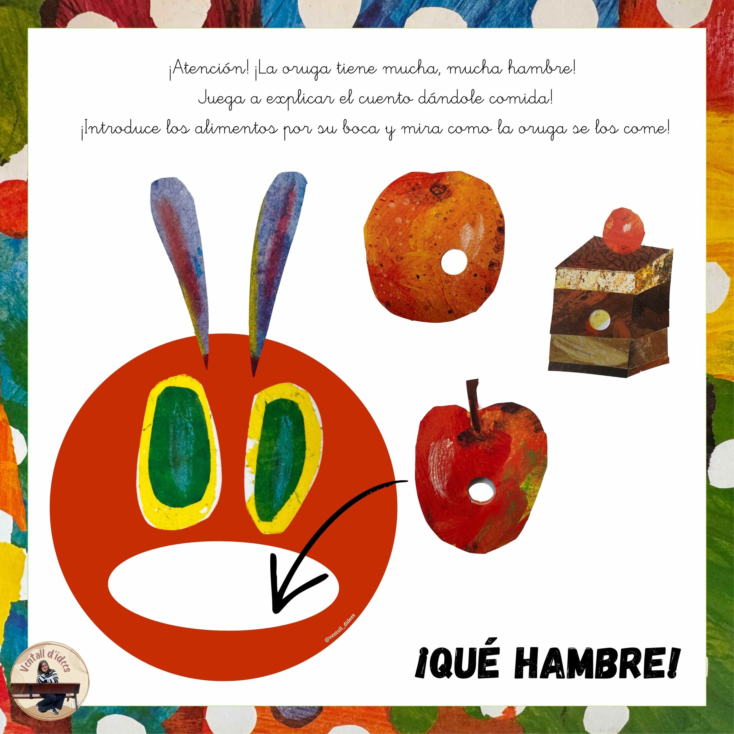 - El segundo recurso es una gran oruga con una boca muy grande, ideal para contar el cuento de forma interactiva. Mientras se narra la historia, los pequeños podrán “alimentar” a la oruga introduciendo los alimentos en su boca, lo que hace la experiencia mucho más participativa y divertida.