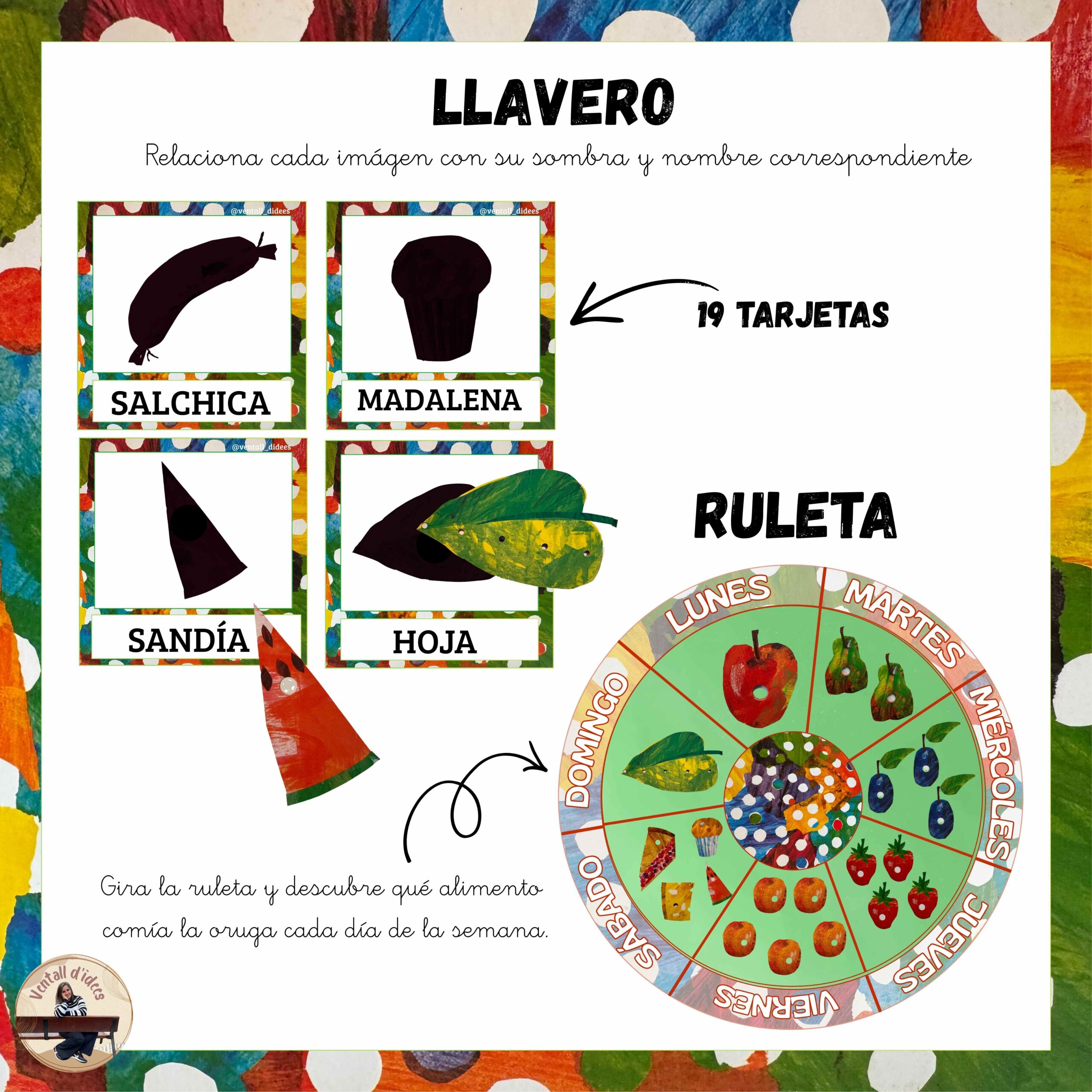 - El cuarto recurso es una ruleta que, al girarla, permite descubrir qué alimento comía la oruga cada día de la semana, reforzando el aprendizaje de la secuencia semanal.