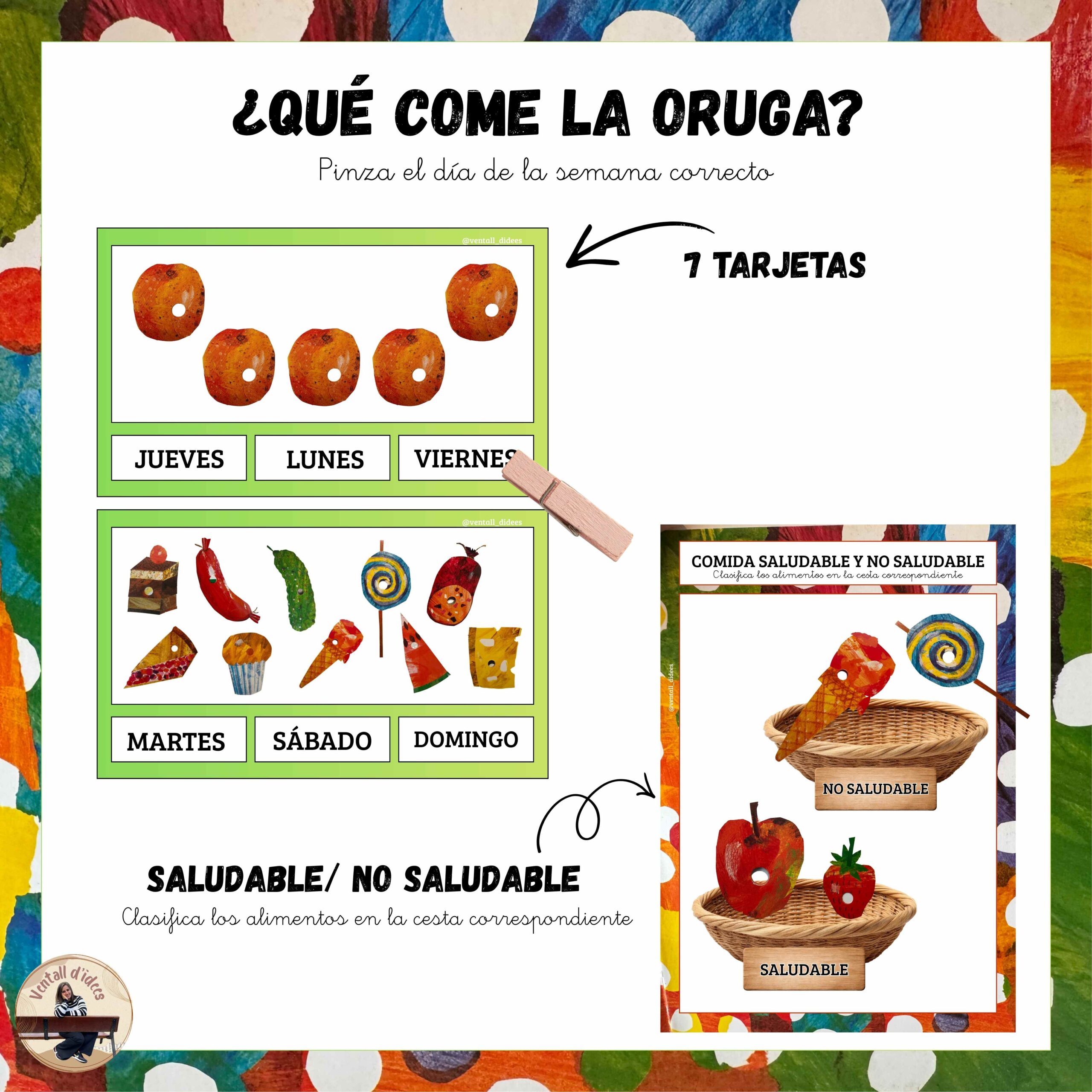 Material didáctico inspirado en el entrañable cuento de La oruga glotona, una historia que destaca no solo por la belleza de sus ilustraciones, sino también por su gran valor educativo. Este cuento permite a los más pequeños aprender de forma divertida los días de la semana, el ciclo de vida de la oruga y la diferencia entre alimentos saludables y no saludables.