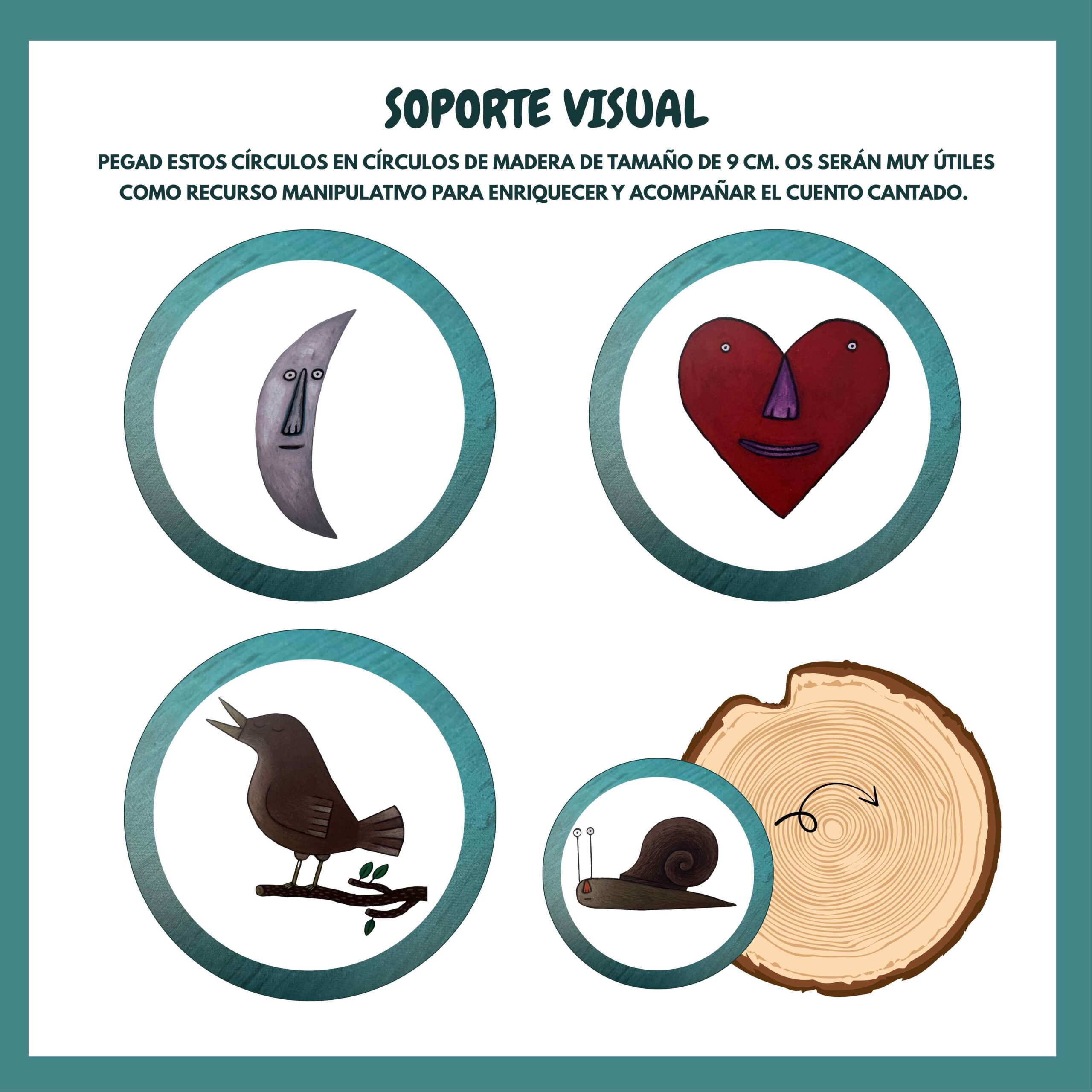 Contiene círculos con los personajes del cuento que pueden pegarse en círculos de madera. De esta forma, se convierte en un material manipulativo que permite acompañar la narración mientras se canta el cuento.