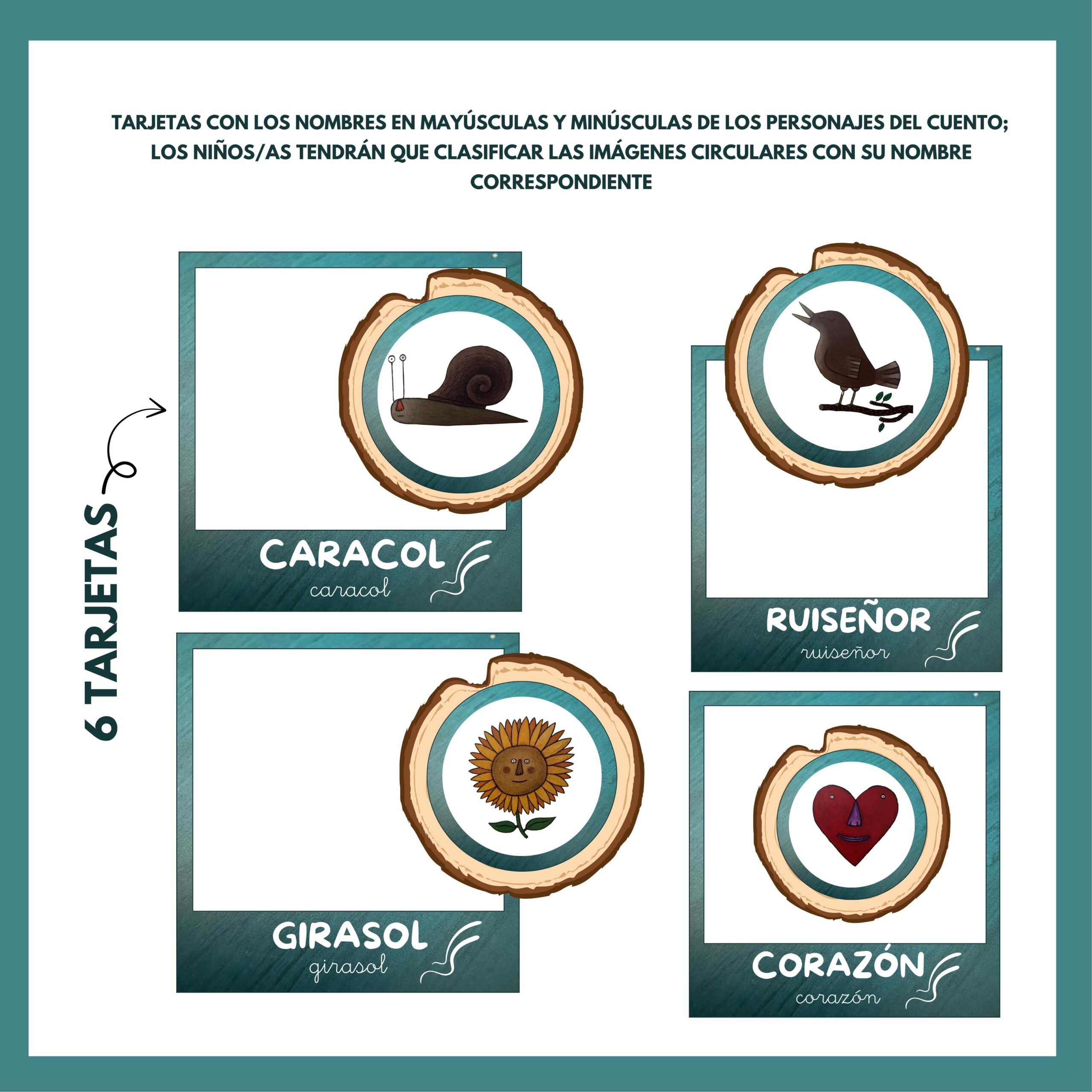 Contiene 6 tarjetas con el nombre de cada personaje en mayúscula y minúscula. L@s niñ@s deben clasificar las piezas circulares en la tarjeta correspondiente, favoreciendo la asociación entre imagen y palabra, el reconocimiento global de palabras y el inicio a la lectoescritura.