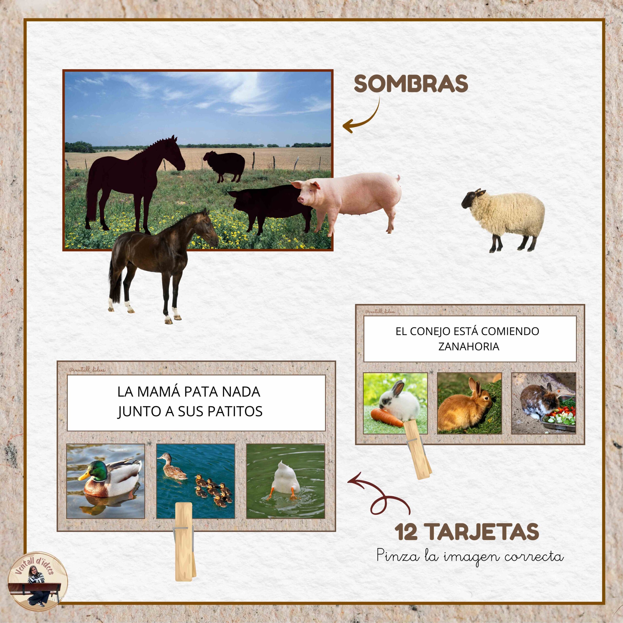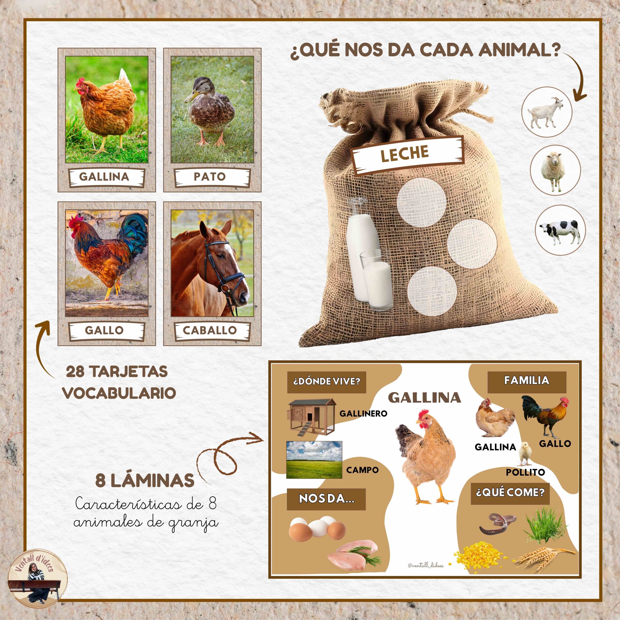 - 8 láminas con las características de los animales de la granja: Indican dónde viven, qué comen, qué productos nos dan y cómo se llaman el macho, la hembra y la cría, fomentando vocabulario específico y comprensión global.