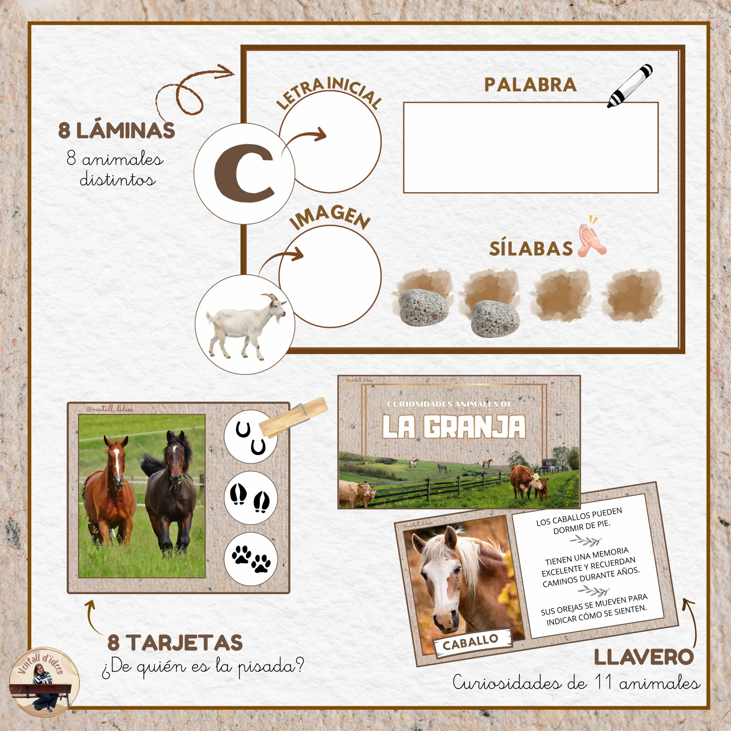 - Llavero con curiosidades de 11 animales de la granja: Refuerza el conocimiento sobre cada animal y sus particularidades.
