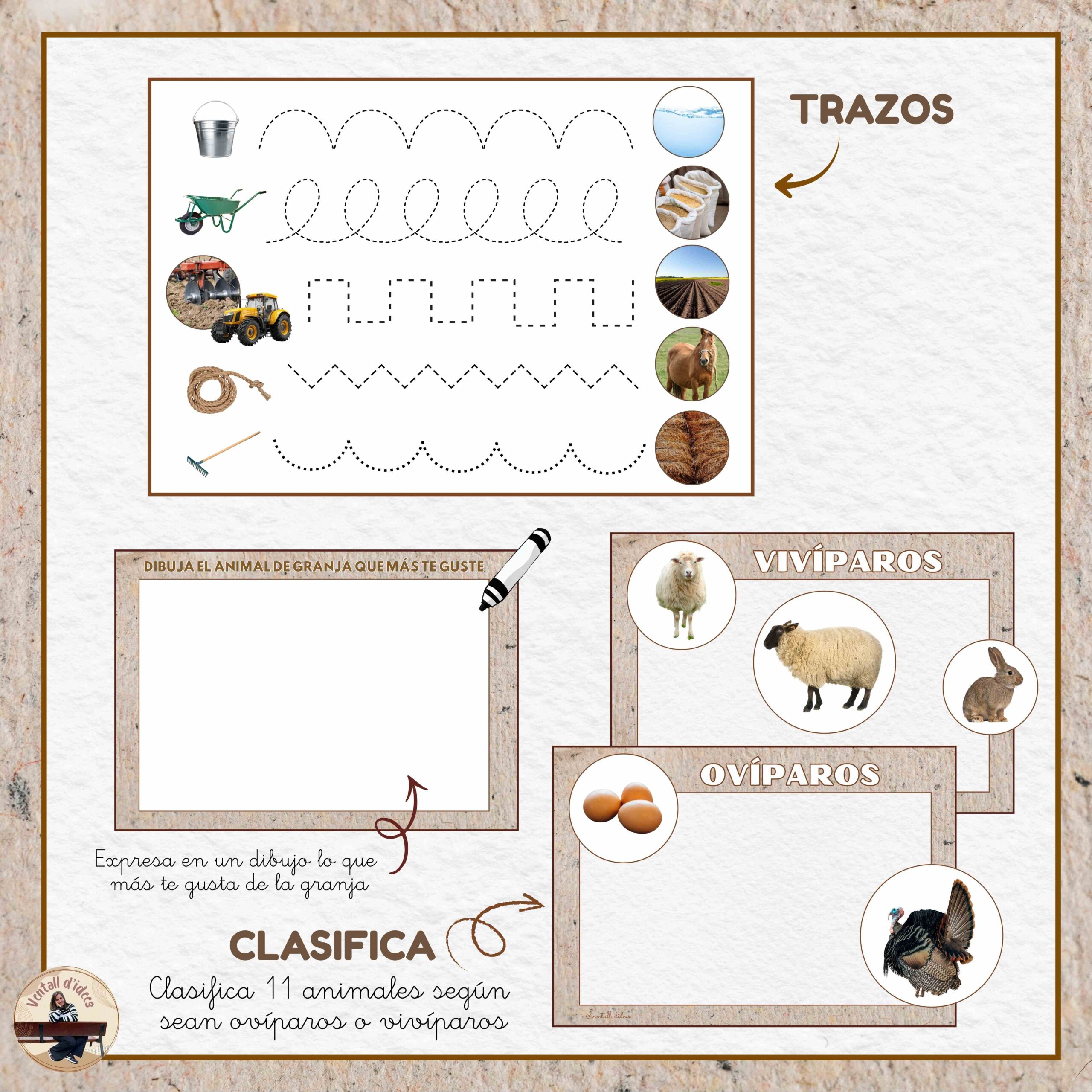 - 2 plantillas para dibujar libremente: Permiten representar lo que más les gusta de la granja y reforzar la comprensión visual.