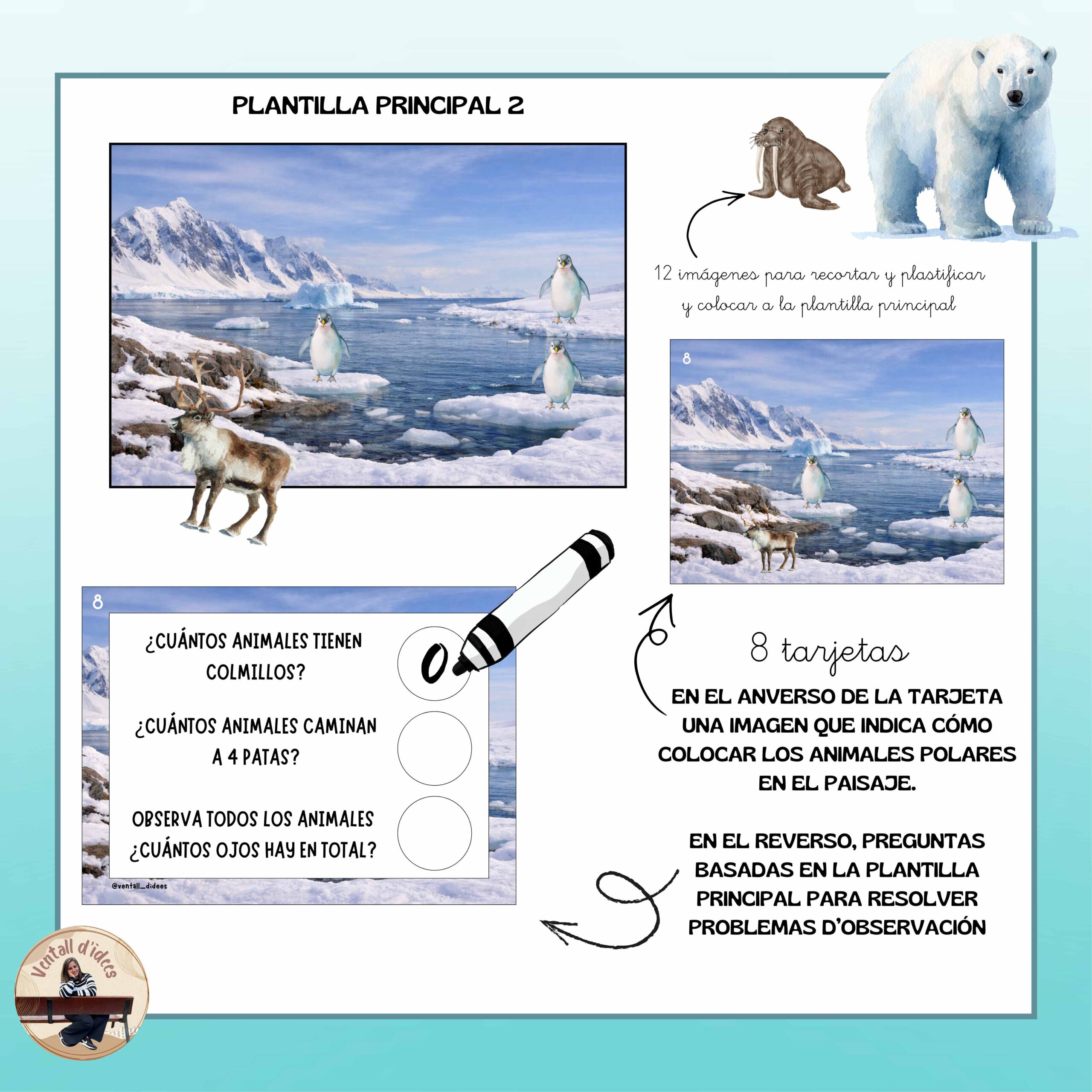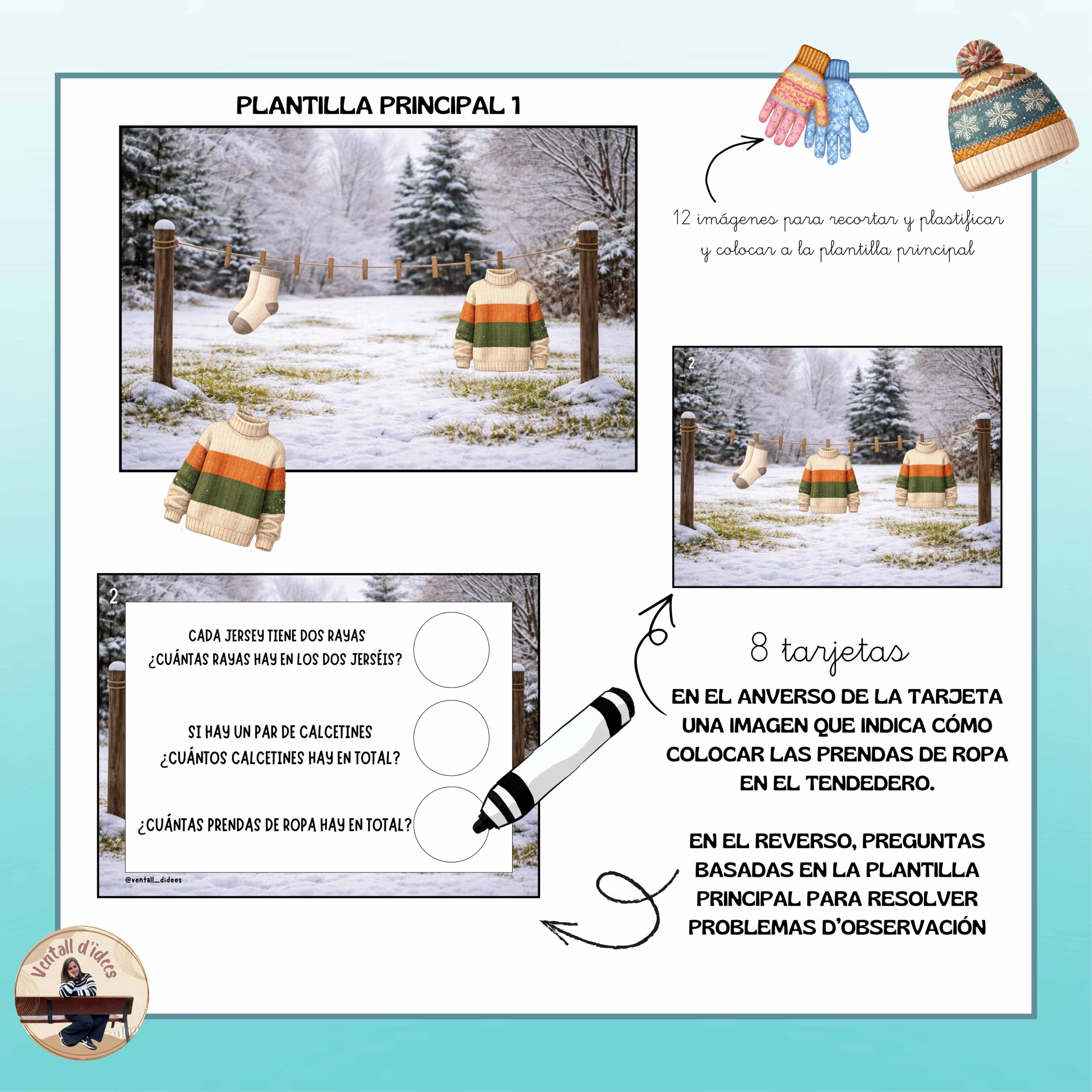 En el anverso de cada tarjeta encontrarás una imagen modelo que indica cómo colocar los elementos (ropa de invierno o animales polares) en la plantilla principal. El niño o la niña deberá reproducir la disposición observada, atendiendo a la posición, la cantidad y la relación entre los elementos.